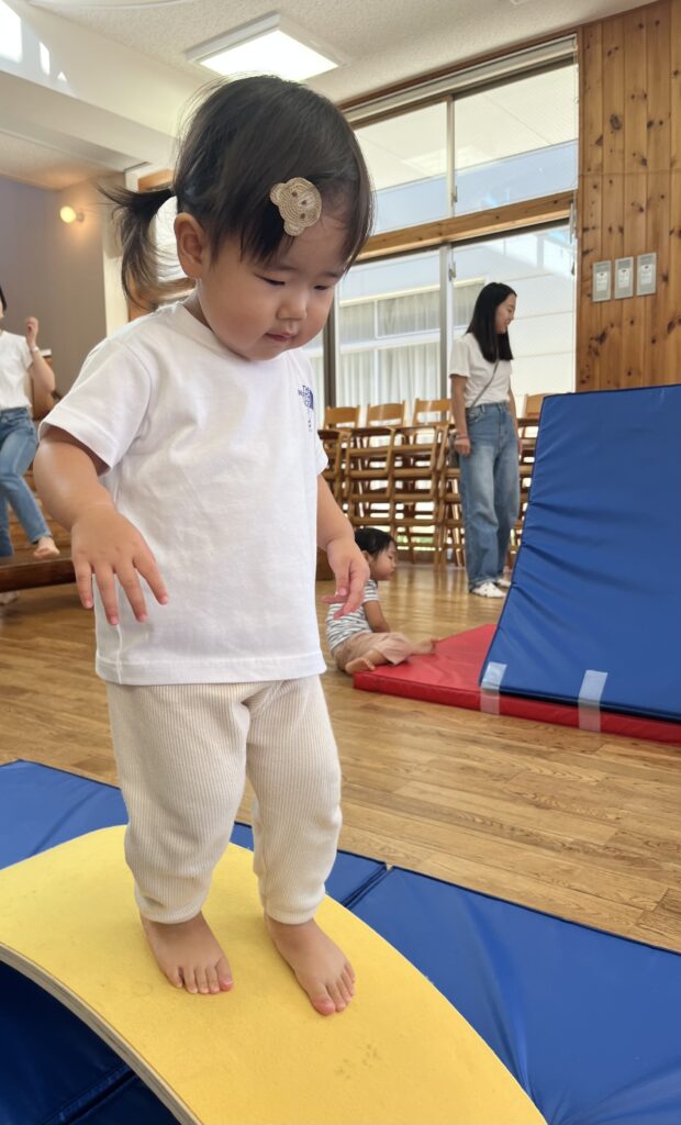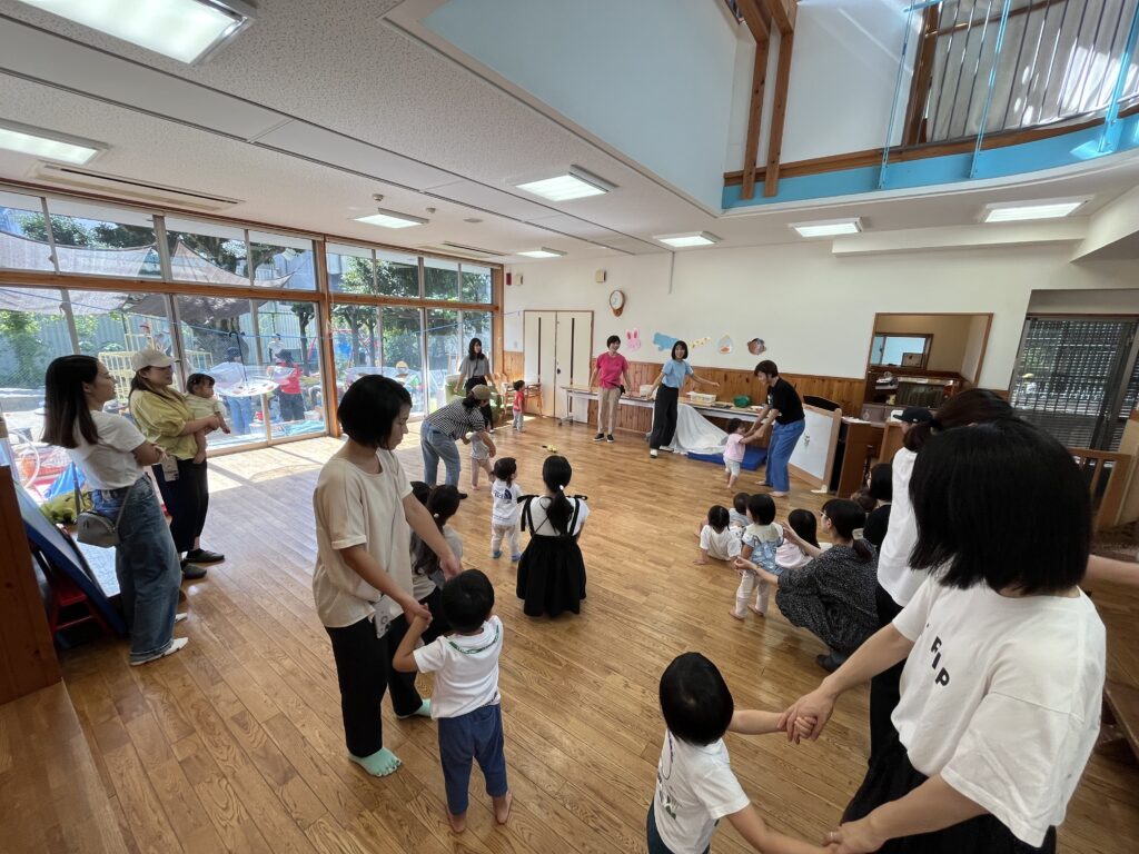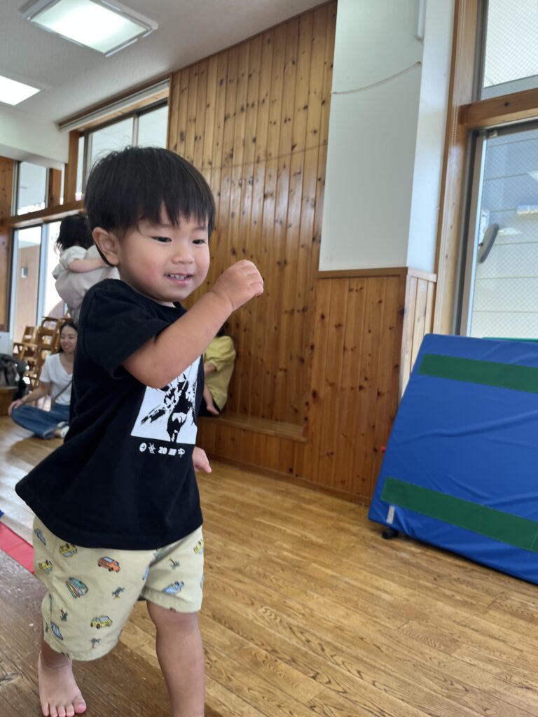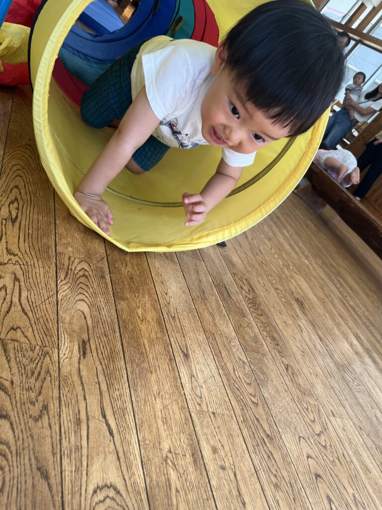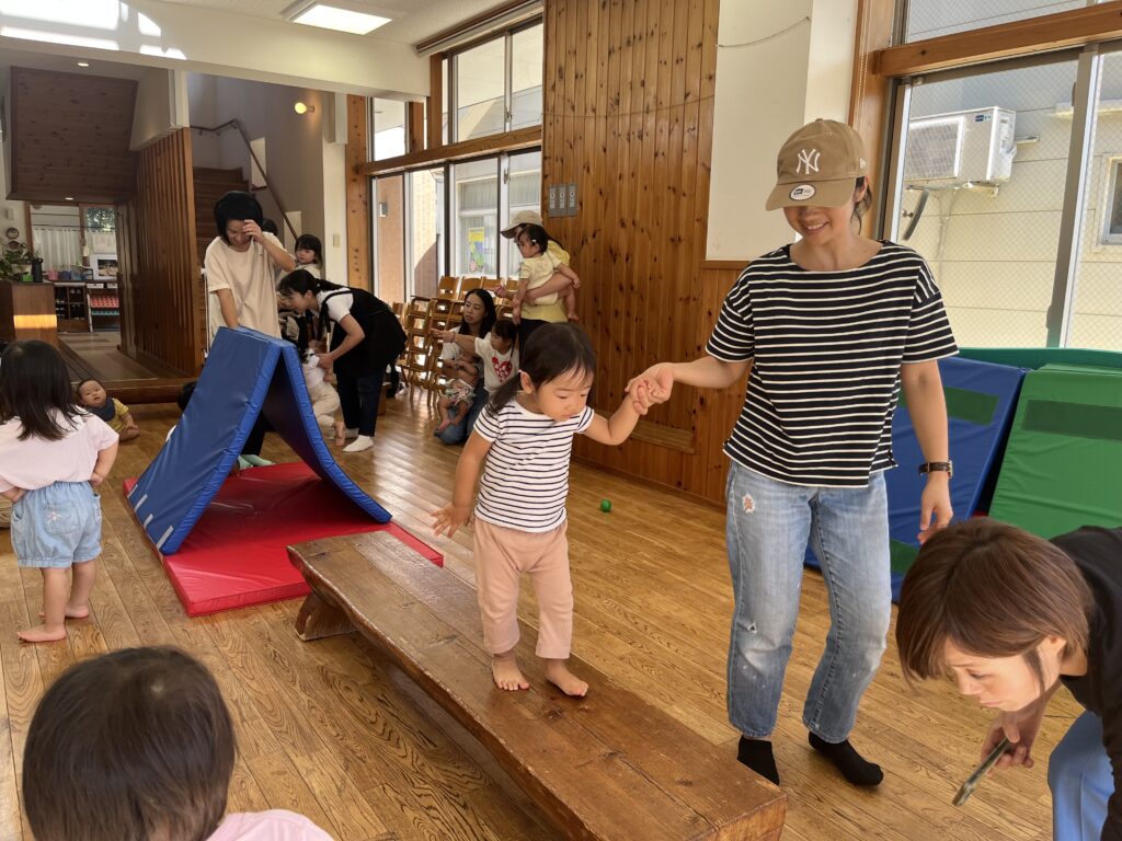 はじめは「どうぶつたいそう1.2.3♪」です。うさぎさん🐰になってぴょんぴょん、ぞうさんは🐘長~いお鼻、へびさんは🐍ニョロニョロ~☆いろいろなどうぶつになったよ❣️次はサーキットで「よーいどん!」2つのコースで遊びました。トンネルをくぐり、お山を登って、橋を渡ります。パパやママが手を繋いでくれたよ☺️❤️