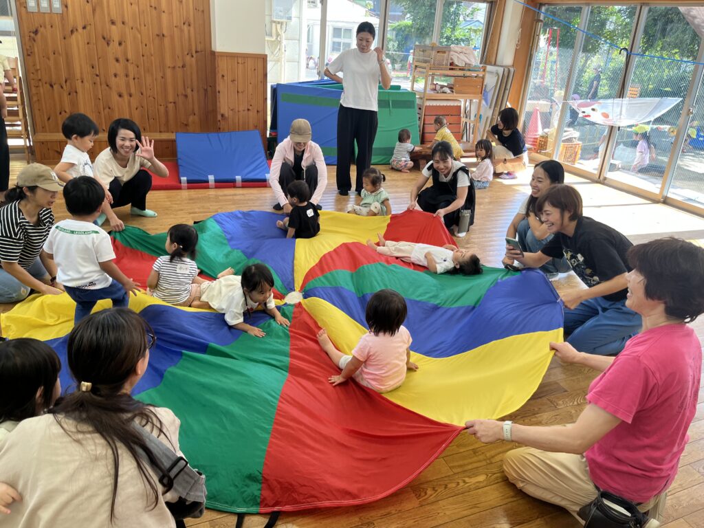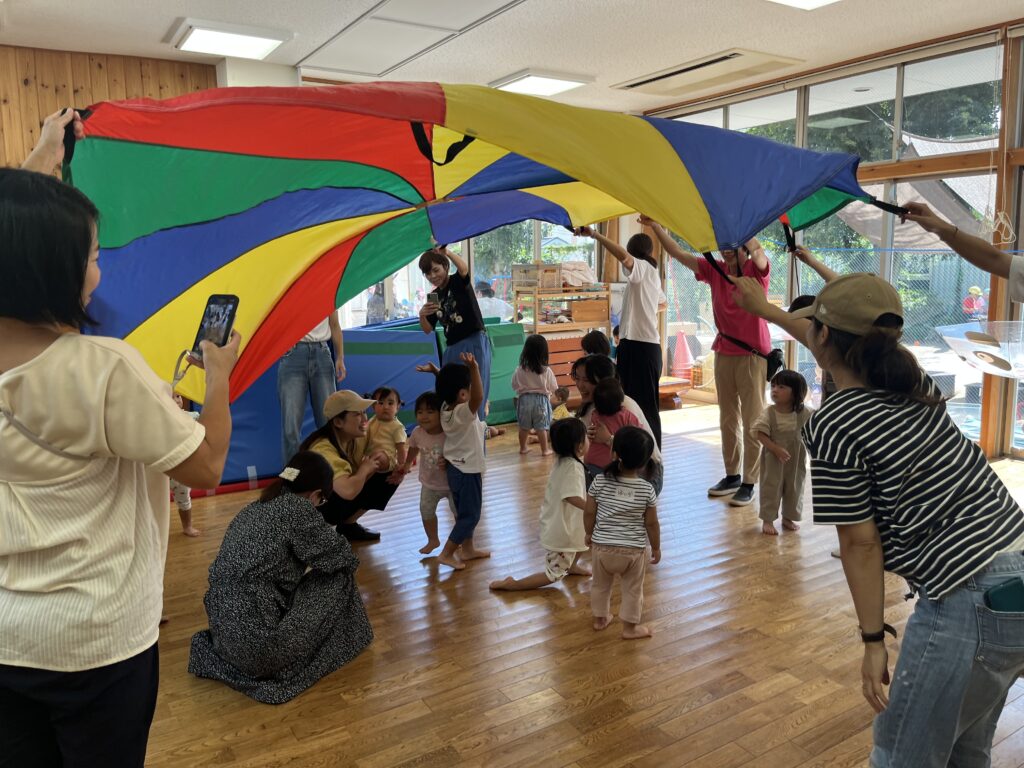 最後はみんなで大きなパラバルーン‼️ゆらゆら、ひらひら、みんな大喜びです。中に入ったり、上にのって寝転んだりして楽しみました。