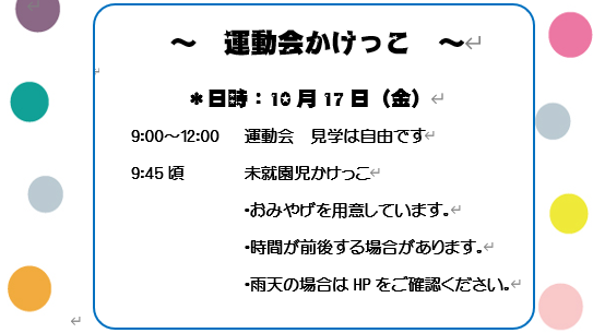 次回は10月17日(金)「光の丘幼稚園の運動会」です。未就園児さんのかけっこがあります☺️予約は不要です。是非ご参加くださいね❣️